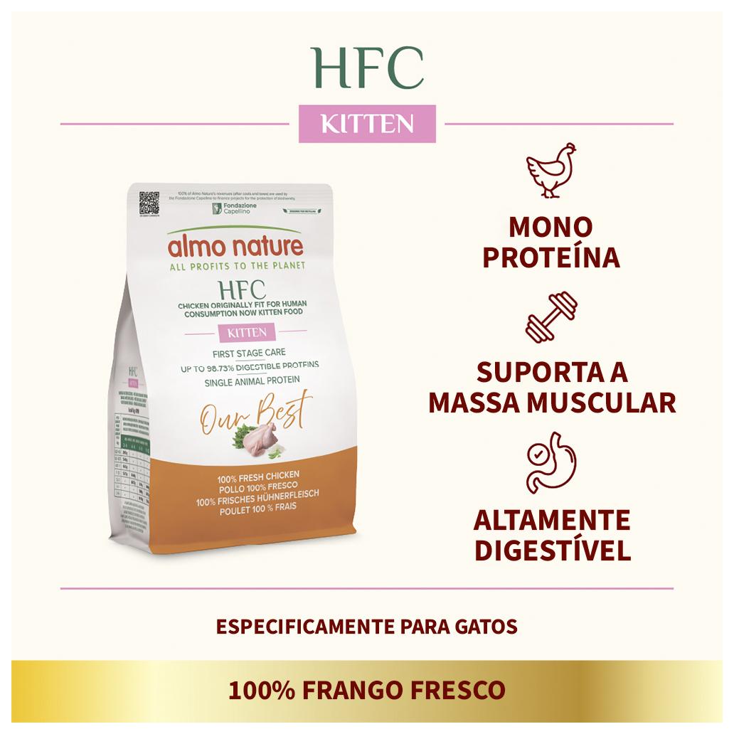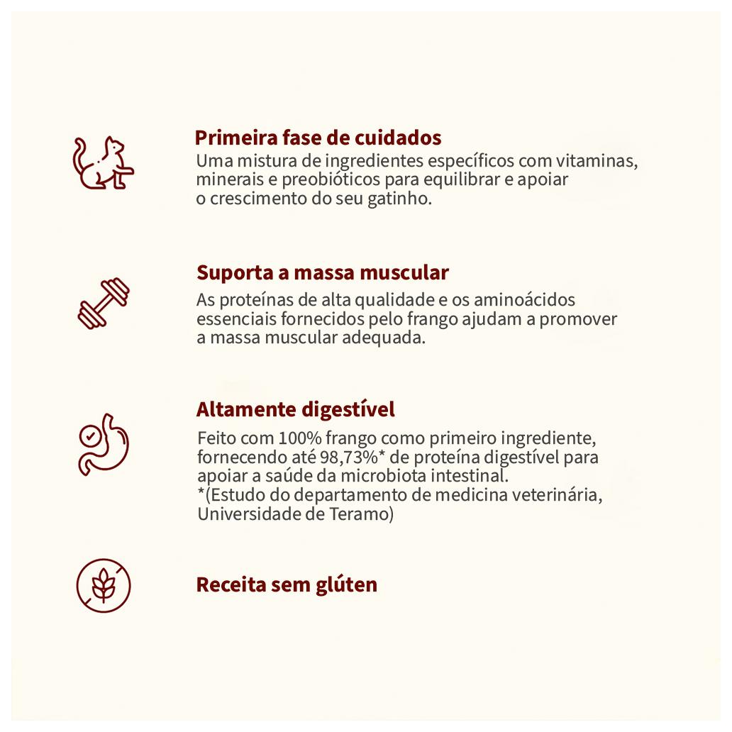- Alimento cozinhado com um conjunto de alimentos específicos, como vitaminas, minerais e prebióticos, que ajudam a manter um crescimento equilibrado do seu gatinho.