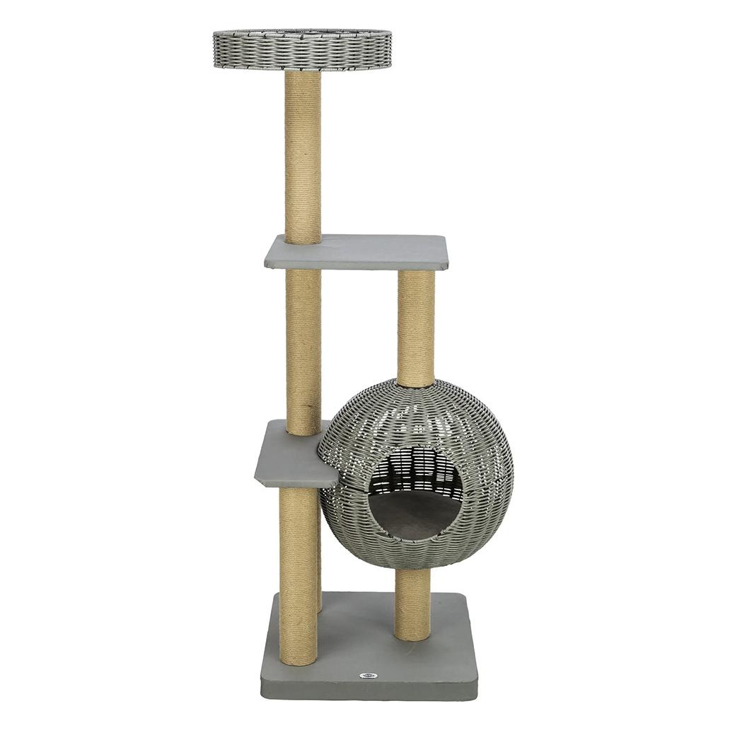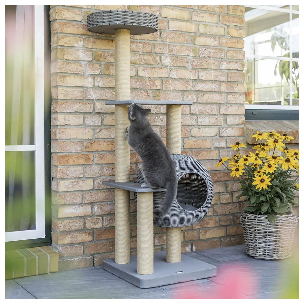 Com o trepador para exterior Amalia, o seu gato também tem um local acolhedor para trepar, arranhar e descansar ao ar livre. A cama e a gruta são feitas de polyrattan, tornando-as particularmente adequadas para uso no exterior. A superfície de descanso almofadada torna a cama aconchegante ainda mais confortável. As correias na placa de base também são práticas e podem ser utilizadas para fixação, garantindo uma base segura. O material de fixação adequado não está incluído.